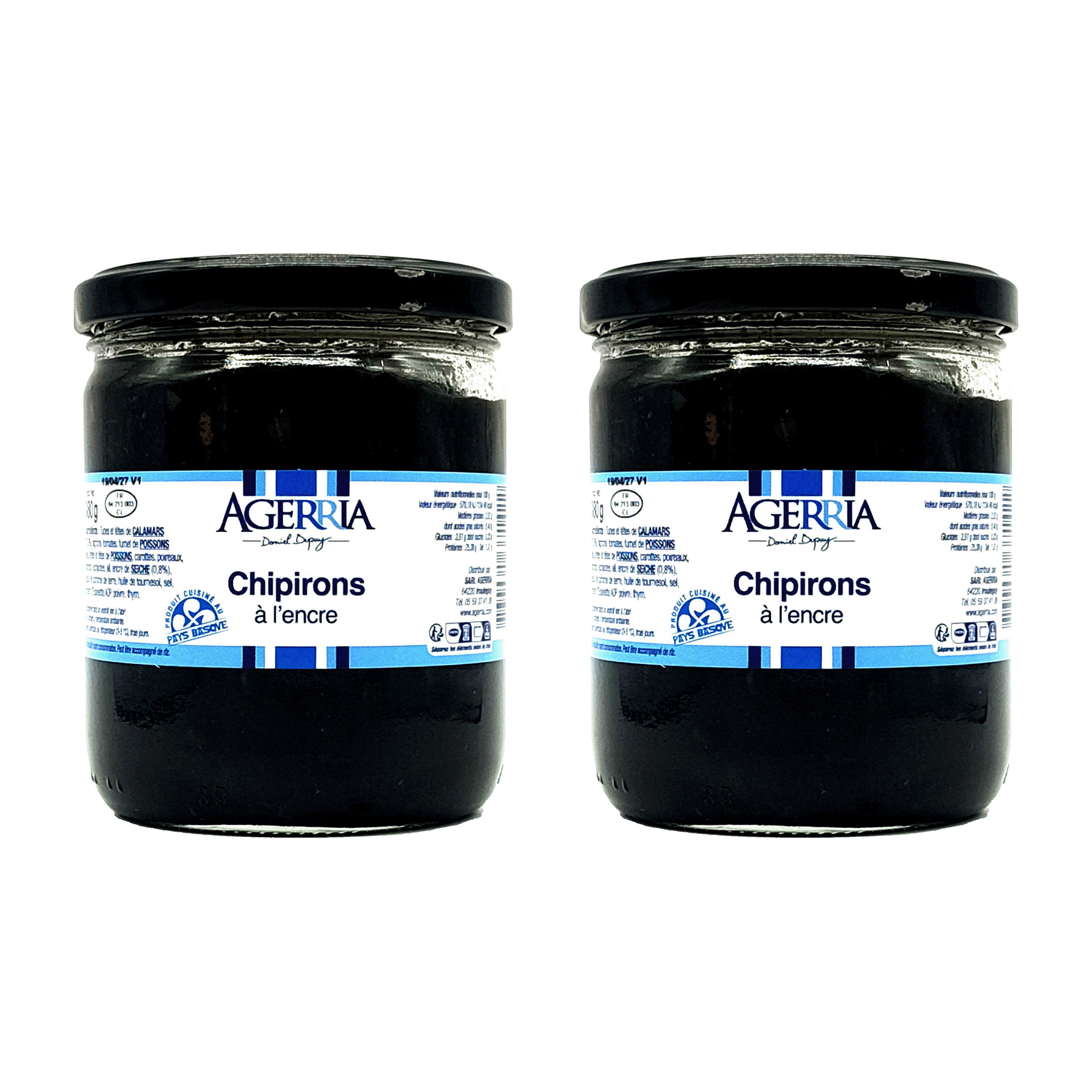 Tubes et têtes de CALAMARS (76%), tomates, oignons, fumet de POISSONS (eau, arêtes et têtes de POISSONS, carottes, poireaux, oignons), poivrons verts doux, huile d'olive, concentré de tomates, ail, sel, encre de seiche (0,8%), poivre, piment d'Espelette AOP.